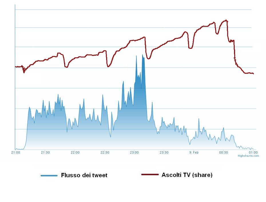 L’unico studio in grado di individuare dati rilevanti è stato il report, battezzato Twitter Causation Study, che ha messo sotto la lente le tendenze di tweet e interazioni, registrate minuto per minuto, rispetto a 221 trasmissioni. Il tutto sfruttando le tecnologie e i sistemi di SocialGuide. La metodologia dell’analisi è stata sviluppata dall’economista premio Nobel, Clive Granger.