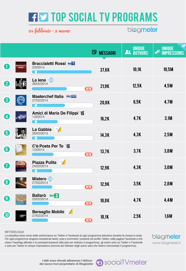 Vediamo, quindi, che la settimana dal 24 febbraio al 2 marzo il primo programma in classifica è l’ultima puntata della miniserie in onda su Rai1 Braccialetti Rossi con 37,6K messaggi (tweet + post), realizzati da 10,1K autori unici (sia di Facebook che di Twitter) per 10,5 milioni di unique impressions (solo di Twitter). Al secondo posto in classifica Le Iene di Italia1 (21,9K messaggi, 12,5K autori unici e 4,5 mln di u.i.). E, in terza posizione, Masterchef Italia (20,8K messaggi, 6,5K autori unici, 4,7 mln di u.i.), su SkyUno, che si sta avvicinando alla finalissima.